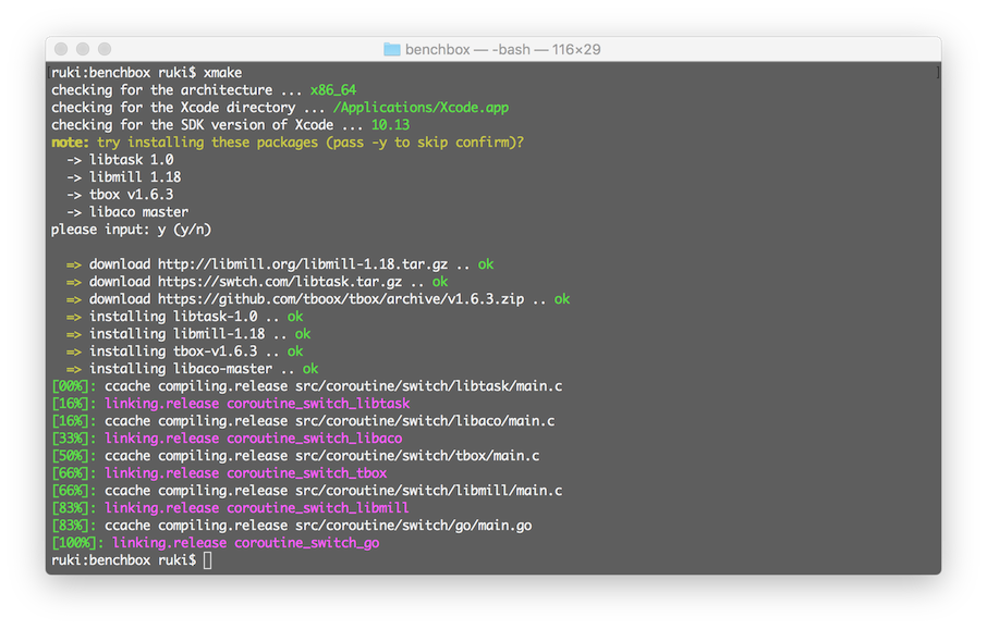 xmake will remotely pull the relevant source package, then automatically compile and install, finally compile the project, and link the dependency package. The specific effect is shown in the following figure: